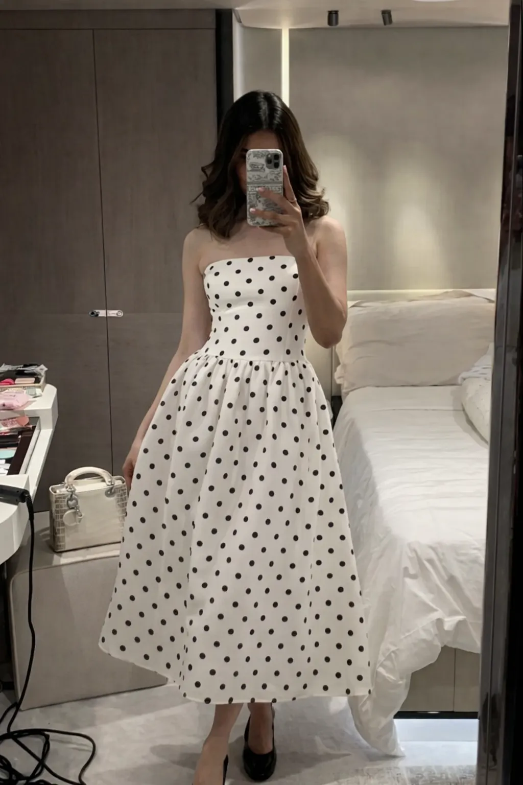 This dress is absolutely adorable! The style is very feminine and flattering, and the polka dot fabric feels comfortable.